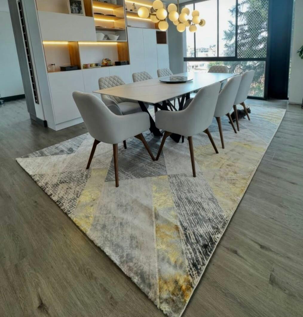 Transforma tu hogar con una pieza que une diseño, modernidad y lujo discreto. Esta alfombra turca combina formas geométricas en tonos grises, beige y dorado, creando un contraste elegante y versátil que se adapta a múltiples estilos decorativos. Su patrón estructurado aporta dinamismo, orden visual y sofisticación, convirtiéndose en el punto focal perfecto para salas modernas, comedores distinguidos o estudios con estética vanguardista. Atemporal y refinada, se integra con facilidad en ambientes minimalistas o contemporáneos, aportando equilibrio y calidez sin perder sobriedad. Más que un accesorio decorativo, es una obra textil diseñada para transformar el espacio con distinción y funcionalidad. Con destellos dorados que reflejan la luz con sutileza, esta alfombra eleva la decoración con un aire exclusivo y sofisticado.
