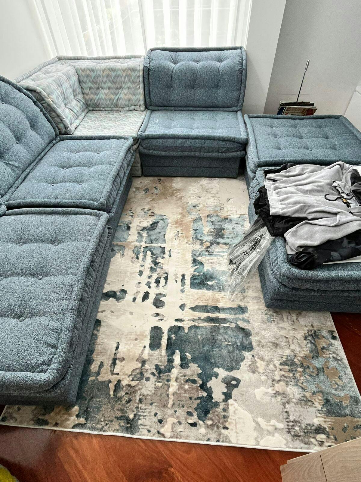 Una pieza moderna y elegante que combina la serenidad del azul profundo con matices grises y toques cálidos en beige. Su diseño abstracto, de formas difusas y texturas visuales, aporta un efecto contemporáneo que transforma cualquier espacio en un ambiente sofisticado.