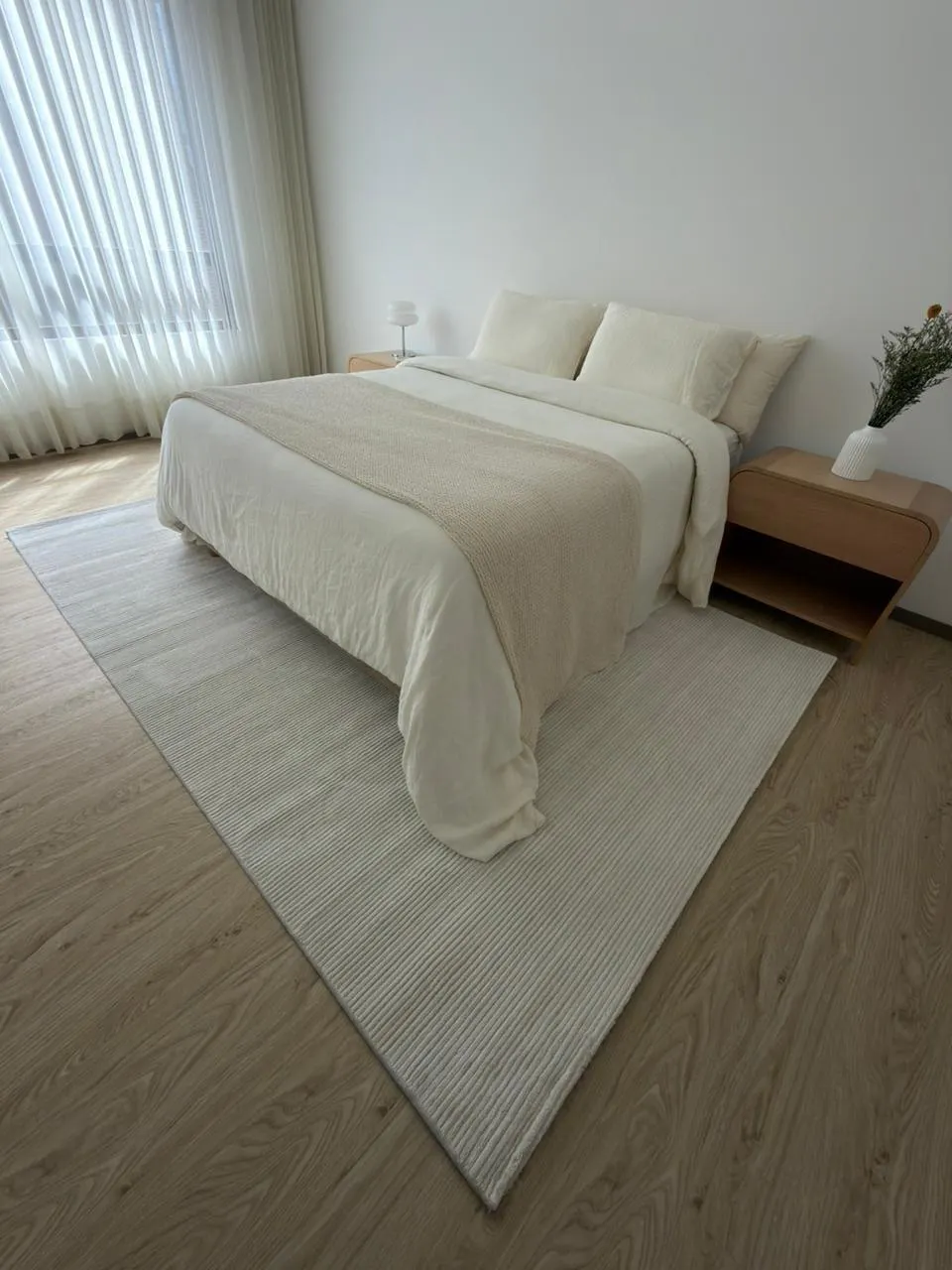 Una alfombra elegante, limpia y atemporal, diseñada para quienes buscan una estética minimalista y moderna. Su patrón de líneas finas horizontales crea una sensación de amplitud, orden y serenidad en cualquier espacio. El tono blanco puro aporta luminosidad y combina con cualquier estilo decorativo, desde nórdico hasta contemporáneo.